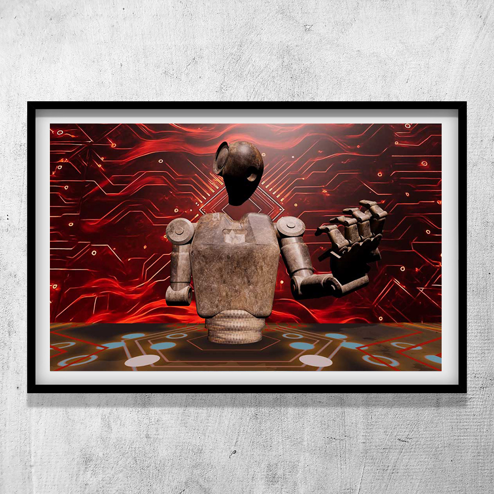 This is not a look of recognition, but one of revelation. The stone robot, a monument to complex construction, confronts the humbling truth of its own lineage. The stone is the first word in the long sentence of progress that culminated in its own existence. In this moment, the artwork frames technological evolution as a closed loop: every complex system, no matter how advanced, is ultimately built upon and indebted to a primitive, foundational idea. The gesture collapses millennia. The robot, a being of logic, is engaged in the most human of acts, that of seeking its own origin, holding the ghost of its own inception in its hand and discovering that its future is inextricably linked to the first tool ever held.