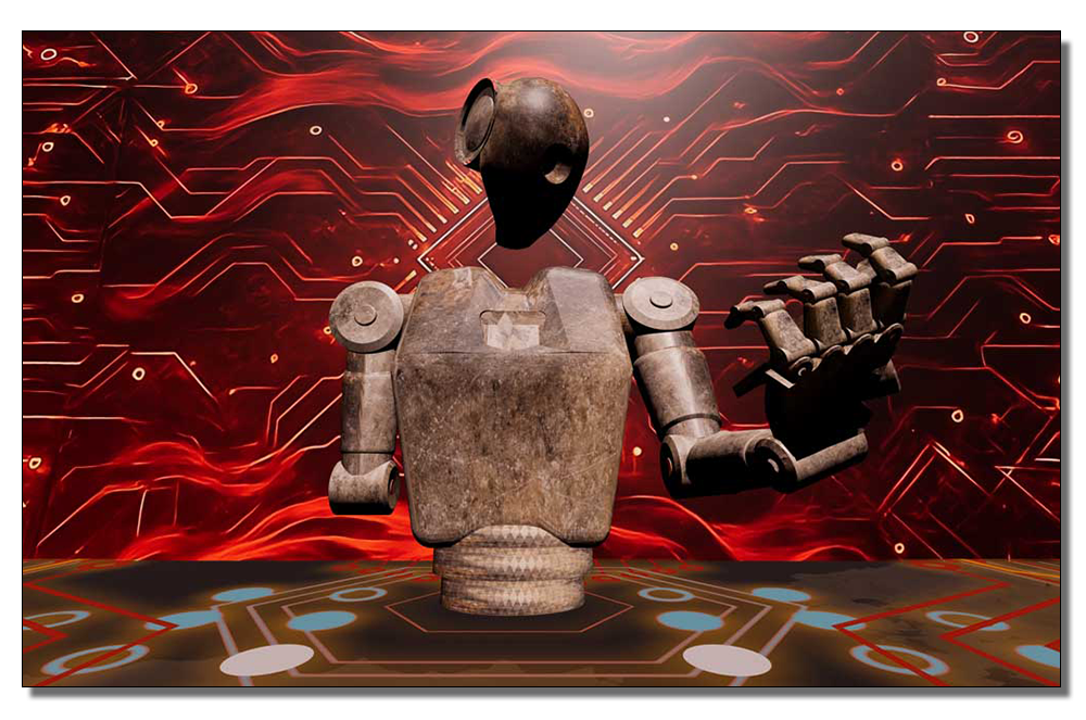 This work stages a silent encounter between the alpha and omega of tool making. A robot, named Brontes, forged not from polished steel but from stone, the very stuff of ancient human architecture, stares down at the primal origin it cradles in its hand: a simple caveman stone.