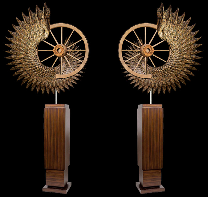 The Looms of Fate is a diptych sculpture that materializes the fundamental mechanism of technological evolution. Each loom is anchored by a spiral of stone age tools, cast in aged concrete to evoke the stratified geology of an ancient time. At the heart of this spiral rests a humble wooden wagon wheel, the crucial innovation that granted humanity leverage over distance and scale.
